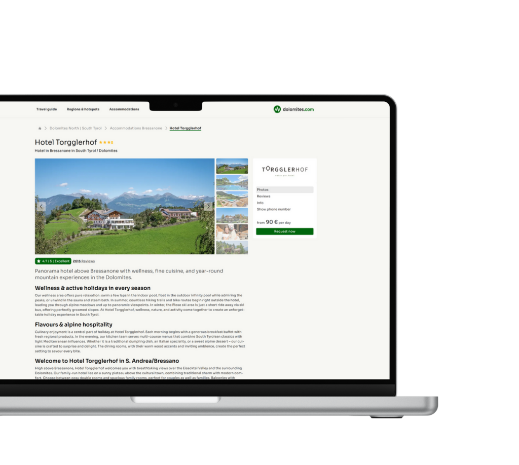 Das Portal bietet Gastbetrieben großzügigen Raum für eine authentische und wirkungsvolle Darstellung. Bis zu 50 Fotos und ein Video zeigen den Betrieb von seiner besten Seite. Der englische Beschreibungstext wird von der Redaktion professionell verfasst. Alle wichtigen Informationen wie Ausstattungsmerkmale, Zimmer und Angebote werden übersichtlich präsentiert, ergänzt durch positive Bewertungen, die Vertrauen schaffen.